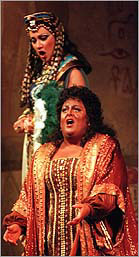 With monumental sets designed by Gianni Quaranta accommodating merely the legs of huge statues that must be presumed to rise into the skies, Ms. Frisell plays up the stately grandeur against which the love triangle of two Egyptian worthies, the warrior Radames and the King's daughter, Amneris, and the Ethiopian slave Aida plays out. But despite throngs of spear carriers, onstage musicians and even horses, these inflated precincts have often seemed rattlingly empty because of glaring weaknesses in the central roles. Not so here, at least among the women. Amneris, in fact, has often been served well in this era rich in mezzo-sopranos, typically with little competition from the Aida, and Olga Borodina may be the most captivating Amneris yet in this production. She sings the role with utter security, as convincing in her overtures to Radames, spurned though they may be, as in her subsequent rages. Carrying herself with regal presence, she develops a character who could stand up to any Aida and upstage most. Then again, Deborah Voigt is not most. Ms. Voigt, who has emerged as a rising star in German repertory, especially the operas of Richard Strauss, here makes a major claim for herself as a Verdi soprano. She seemed tentative at first, an impression fostered by her unprepossessing appearance, resulting in part from a silly-looking, perhaps ill-fitting black wig. But as the evening progressed, particularly with "O patria mia" in the third act, it appeared that Ms. Voigt had simply been pacing herself cannily. An act later, she was still singing with free, full, lovely tone. Her little cascading descent from her final high note was as melting as one could want. Fabio Armiliato's Radames was an altogether sadder story. Although Mr. Armiliato could produce clarion sounds to rival the onstage trumpets, he often got to those tones by way of ungainly heaves and swoops and had a hard time sustaining them without spinning sharp. Yet by the end of a strained evening, he tended everywhere toward flatness. Nikolai Putilin was strong yet affecting as Amonasro. Peter Rose, as Ramfis, and Dean Peterson, as the King of Egypt, sang with solidity if little color. With Carlo Rizzi conducting, the orchestra had not yet come into focus, and coordination with the stage was occasionally tenuous. Those matters, like the accident-prone lighting, will undoubtedly be ironed out in future performances, beginning this evening. When they are, this may be as persuasive an outing as Ms. Frisell's production has had. |