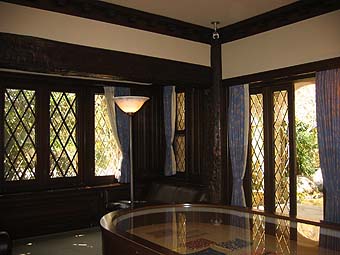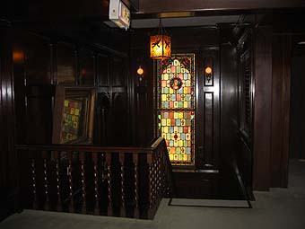 | 階段の踊り場にあるステンドグラス | 日本庭園に面したテラス |