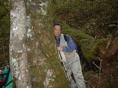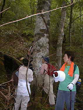 | 右上ミズナラの苔むした幹 | ブナの幹に耳を付けて水を吸い上げる音を聞く(ドックンドックン?) |