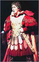 In the title role, Jennifer Larmore stands on the ground as if she owns it and sings with the same command. Her tone is bright and eager, and her phrases leap into action. She is especially good in Caesar's martial numbers: she seems to enjoy the scent of musical battle and the chance to engage vividly and vigorously with the orchestra. She also has fun with the cross-dressing. Though she looks good as a man, her voice is richly and gloriously female, and in playing the world conqueror she is humorously aware of the deception she is imposing. One hears the smile behind the mask. Handel's two contrasted heroines, the noble and the naughty, are presented by Stephanie Blythe and Hei-Kyung Hong. Ms. Blythe, as Cornelia, is magnificent. In everything she does, she combines poignancy with stateliness, true in that to the aesthetics of the Baroque. Also very much in style is her use of vibrato as an expressive device. She thereby brings forward a remarkable range of vocal colors, from the stony to the feather light or creamy, all apt to the meaning of the moment and smoothly worked into the phrase. Hers is a resourceful and even daring performance, too, in how she allows her voice to fall to the level of the instruments at times, or to bloom slowly out from instrumental tone. Ms. Hong is a brilliant performer, and in this she is the image of her character, Cleopatra. Her voice shines, and her projection is unerring, as is her agility. Though she sings marvelously in one of the great Baroque laments, "Piangero," from a quiet center and with beautiful ornaments falling into the repeat section like slow tears, one is never quite sure of her emotional truthfulness. And this is right: after all, Cleopatra spends most of the opera using the guiles of love to further her familial-political intrigue, and at the end, just as one begins to think she might really be in love with Caesar, cheerfully exchanges his heart for his hand in helping her onto the throne. Ms. Hong excellently conveys the character's sense of singing as power, and in her fast arias her decorations are as exact, dazzling and effective as the rhinestones on her several tiaras. There is a nice and useful difference, too, between the countertenors, David Daniels and Brian Asawa. Mr. Daniels, as Sextus, is characteristically and exquisitely sweet and yet also completely fresh, as if singing this way were the most natural thing in the world. Generally he comes to the same position for each of his arias, center stage left, and just sings. This is all he has to do. In a similar way, he maintains the same vocal character−− honeyed, sensual −− within which he can run the gamut from mourning to protest. It is quite an achievement to present a character for whom sex is not an issue, to do so frankly and believably, and yet all the time to be singing so seductively. Mr. Asawa accomplishes a difficult task, too, in singing and acting the weakling schemer, Ptolemy. He uses the coolness and artificiality of falsetto to convey the character's decadence and nastiness, but at the same time his singing is immediate, forceful and alert. He also moves well and uses a series of extravagant costumes to his advantage at every turn. Among all these high fliers, Julien Robbins has the bass role of Achillas, in which he is appropriately soft and strong. With his height and by his singing, he suggests a big, simple soul misled by love. John Nelson conducts an able, straightforward orchestral performance, with luscious plucked strings in much of the slow music, capable obbligato soloists and some electric uptempo movements. The remaining performances will be tonight and Saturday afternoon. |