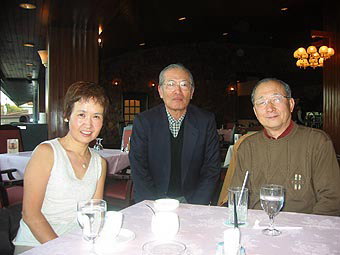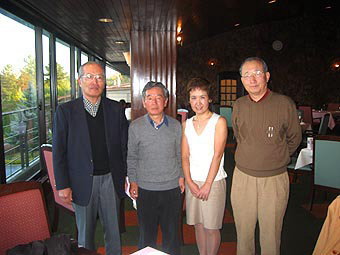 107 | 早崎、折坂、小林 | メール仲間の恒例ゴルフで今回はモイチが幹事。夜は夫婦4組が 揃ってリーガ・ロイヤルホテルの天壇王府で豪華ディナーの趣向。 ところが今週この日だけ天気が悪く気が気ではなかった。幸い、 大した雨にはならずなんとか最後までプレーできた。今日は、礒川 さんから借りたERCIIをティーショットに使ったがなかなか良い感触 だった。前半、40台後半のスコアで来たのに8番でそのドライバー を大きくスライスしてOBし、次ぎの9番では第2打がバンカーに 捕まり連続トリプルとなった。後半は出足の10番でOB2発の10 を叩いて戦意喪失。小林さん、ゴルフは久しぶりといいながら49・ 44とひとり好調なゴルフ。早さん、折さんはパットに苦労。 |