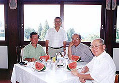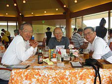 今回は待望の津CC。あの名人野村さんが108も叩き、二度と来たく ないといったという難コース。特にはしご段のついた恐怖の深いバンカー には絶対入れてはいけない。前半、バンカーを避けて順調に40台の ペースで来ていたのに、小林さんに煽られて、8番・9番でグリーンを 狙った会心のショットがもうちょっとのところでついに深いバンカーに 捕まり、合わせて5打の損。昼食後の後半はティー・ショットが乱れて 挽回ならず。地主の小林さんは最後11を叩きながらも98、早さん、 膝痛を庇いつつ99は立派。 |
