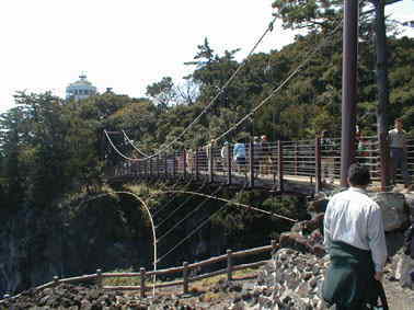 城が崎海岸の吊り橋(灯台の頭が見える)
