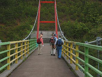 | 朽木温泉への下りはこんな階段道ばかり | 途中の吊橋からみた蛇谷ガ峰の新緑 |