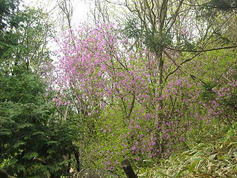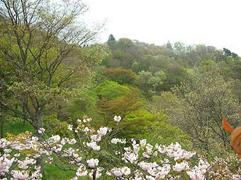 | ロープウェー駅近くの眺望 | 頂上付近の芽吹きとヤマザクラ |