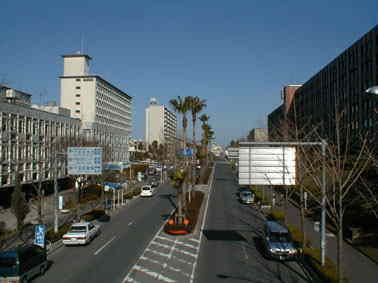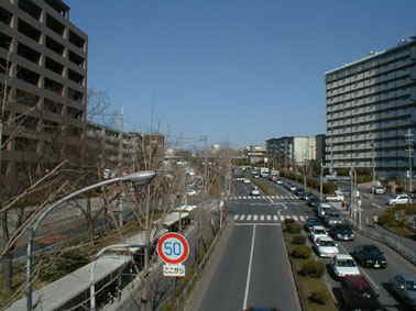 | 阪急南千里駅東側陸橋から高野台方向を望む。 中央分離帯にヤシの並木。 |
