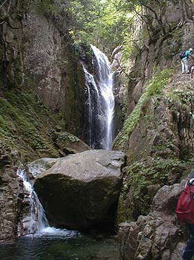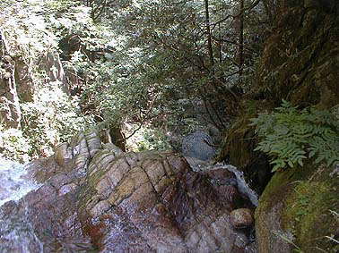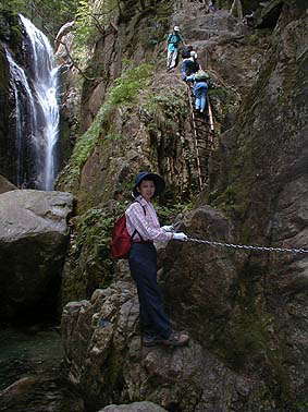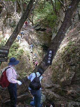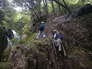 | 貴船の滝を下から眺める | 滝の横の絶壁を這い登る |